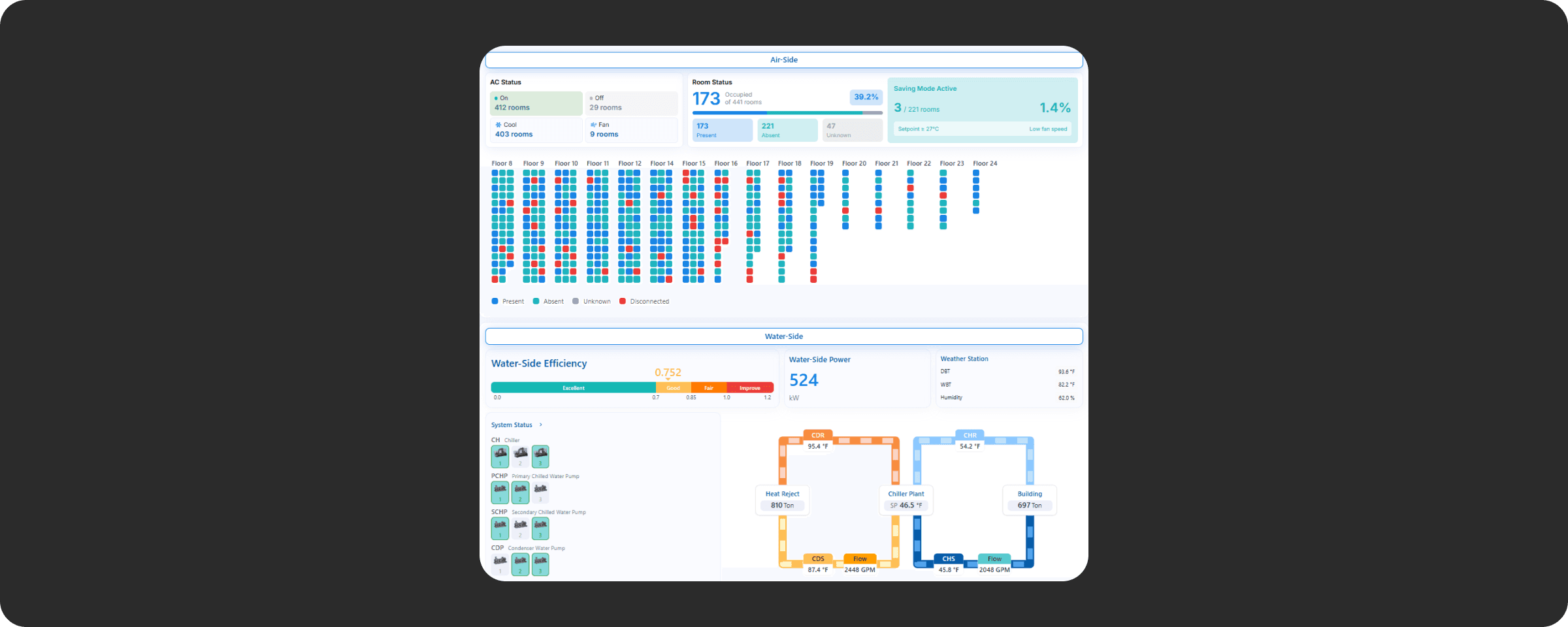Connects zone-level comfort data with plant-level efficiency, so operators and building owners see the full picture — from individual room temperatures to total plant energy consumption.