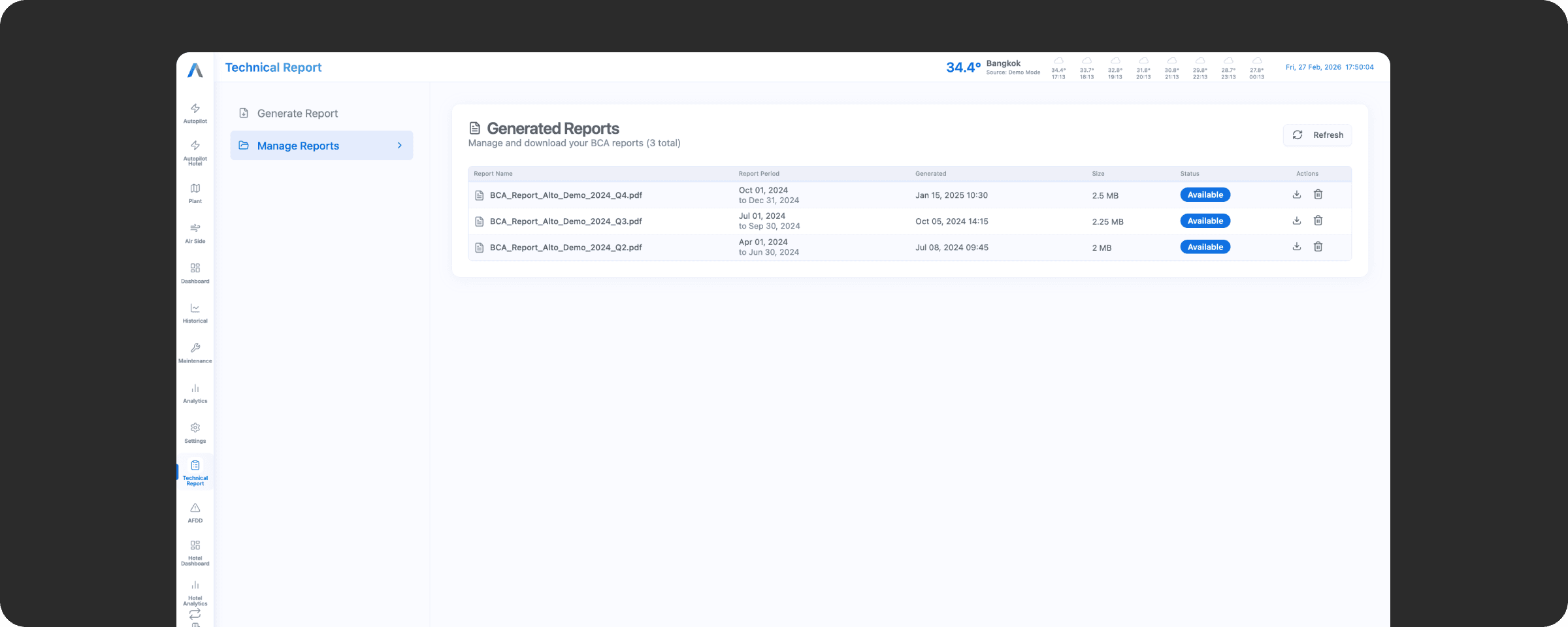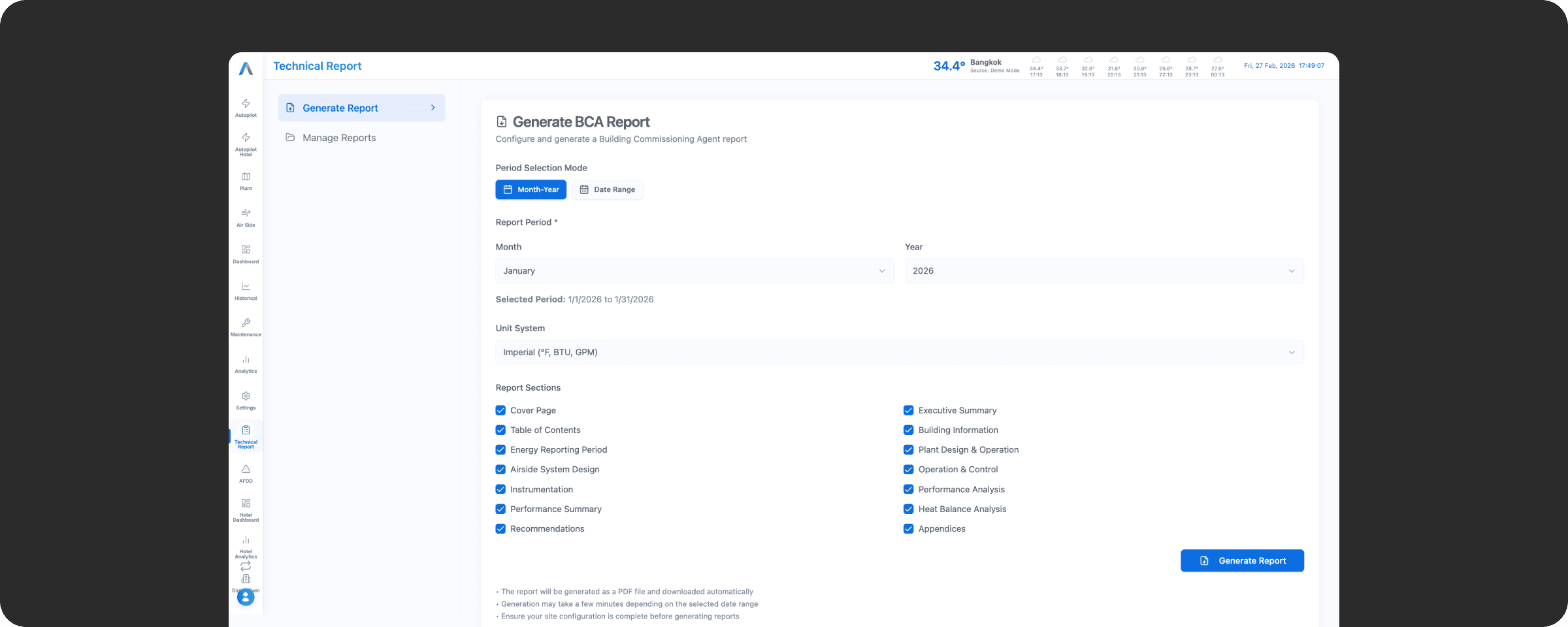 Auto Report (Water-side) transforms your chilled water system performance into a structured, downloadable Building Commissioning Agent (BCA) report in just a few clicks. Instead of manually compiling plant design, operation logs, performance trends, and heat balance analysis, the system generates a professional PDF report covering your entire water-side system.