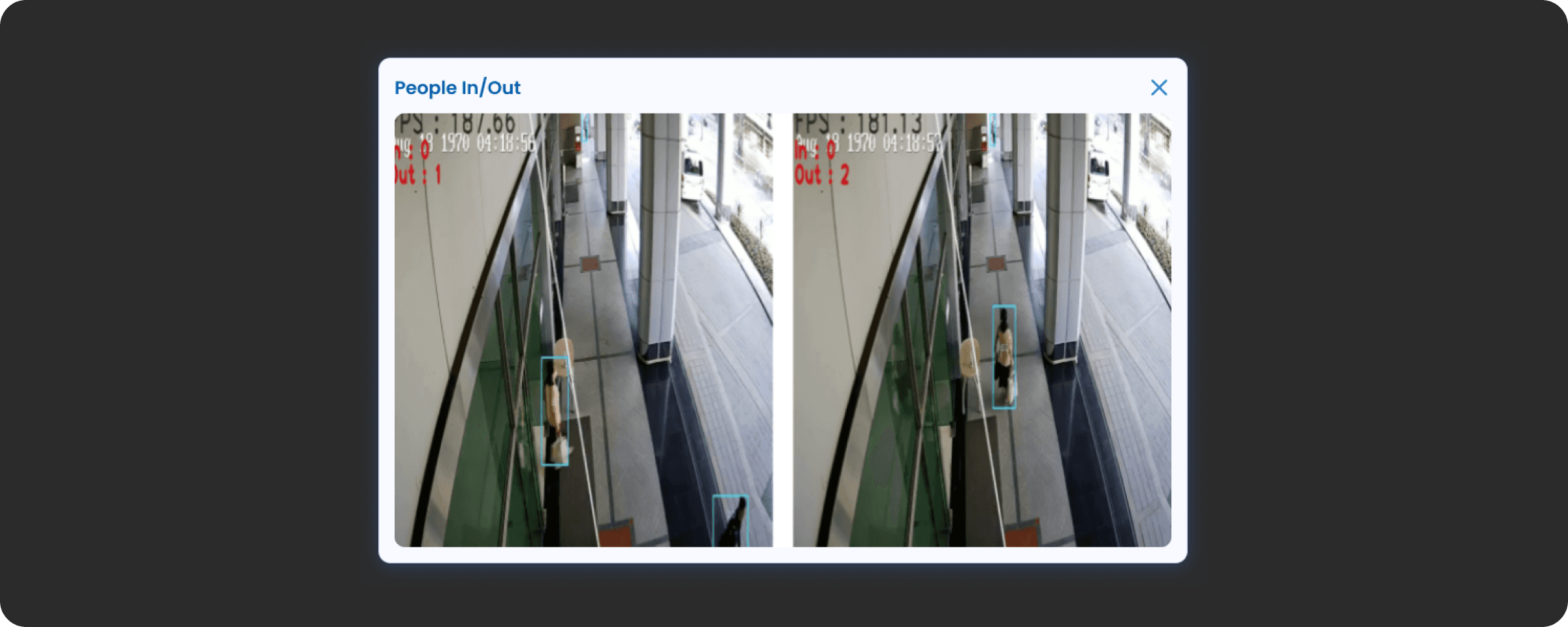 People In/Out counts how many people go IN and OUT at each entrance, then calculates net occupancy in real time for clear crowd-flow monitoring. It also supports real-time video streaming for continuous entrance oversight via a client website. This is a core building block for a Smart Building Solution and can support IoT for energy management by enabling occupancy-driven actions (e.g., HVAC/lighting schedules) that contribute to AI Energy Saving initiatives.