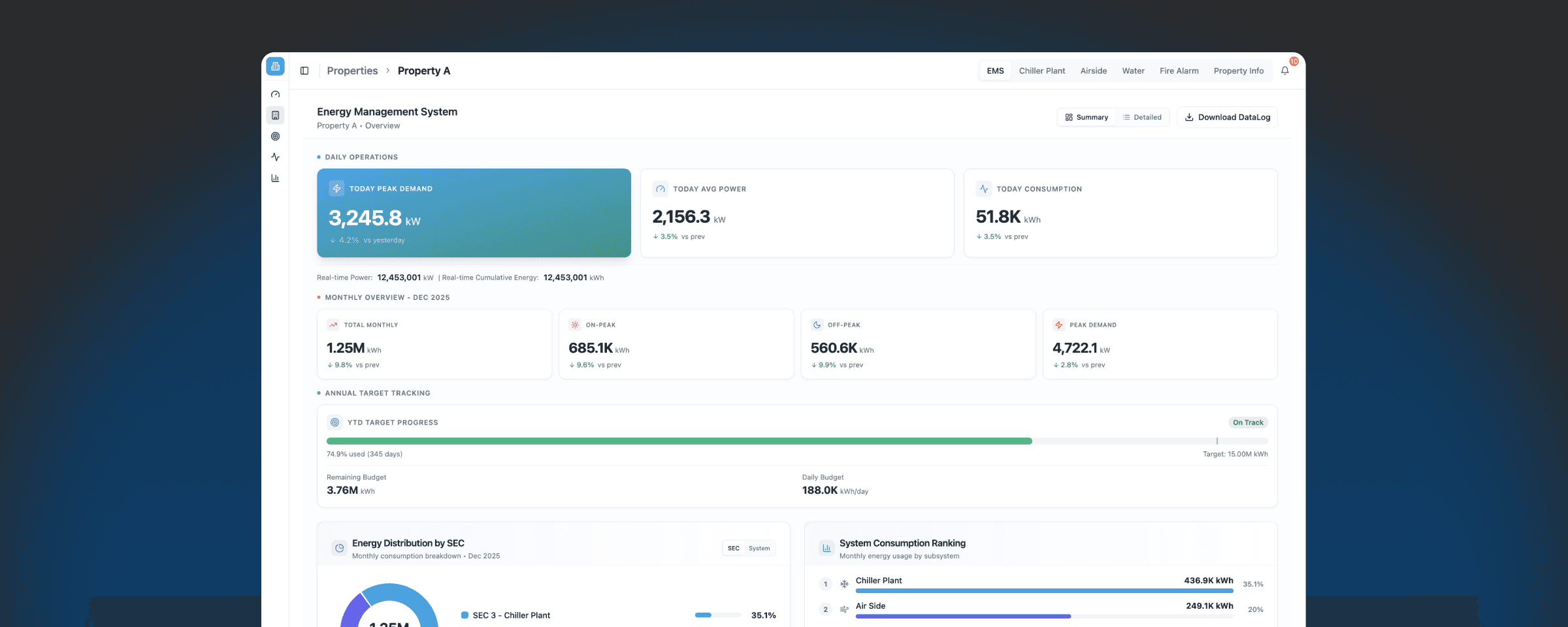 ESG Reporting for Real Estate Thailand: Track annual target progress and energy distribution by subsystem to support ESG reporting and sustainability compliance.