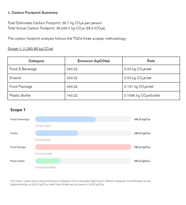 Providing a comprehensive breakdown of an event’s carbon footprint, comparing estimated vs. actual emissions. It highlights key sources across Scope 1-3, tracks attendee impact, and identifies trends. Post-event insights help pinpoint areas for improvement, while automated reports support TGO certification and future sustainability planning.