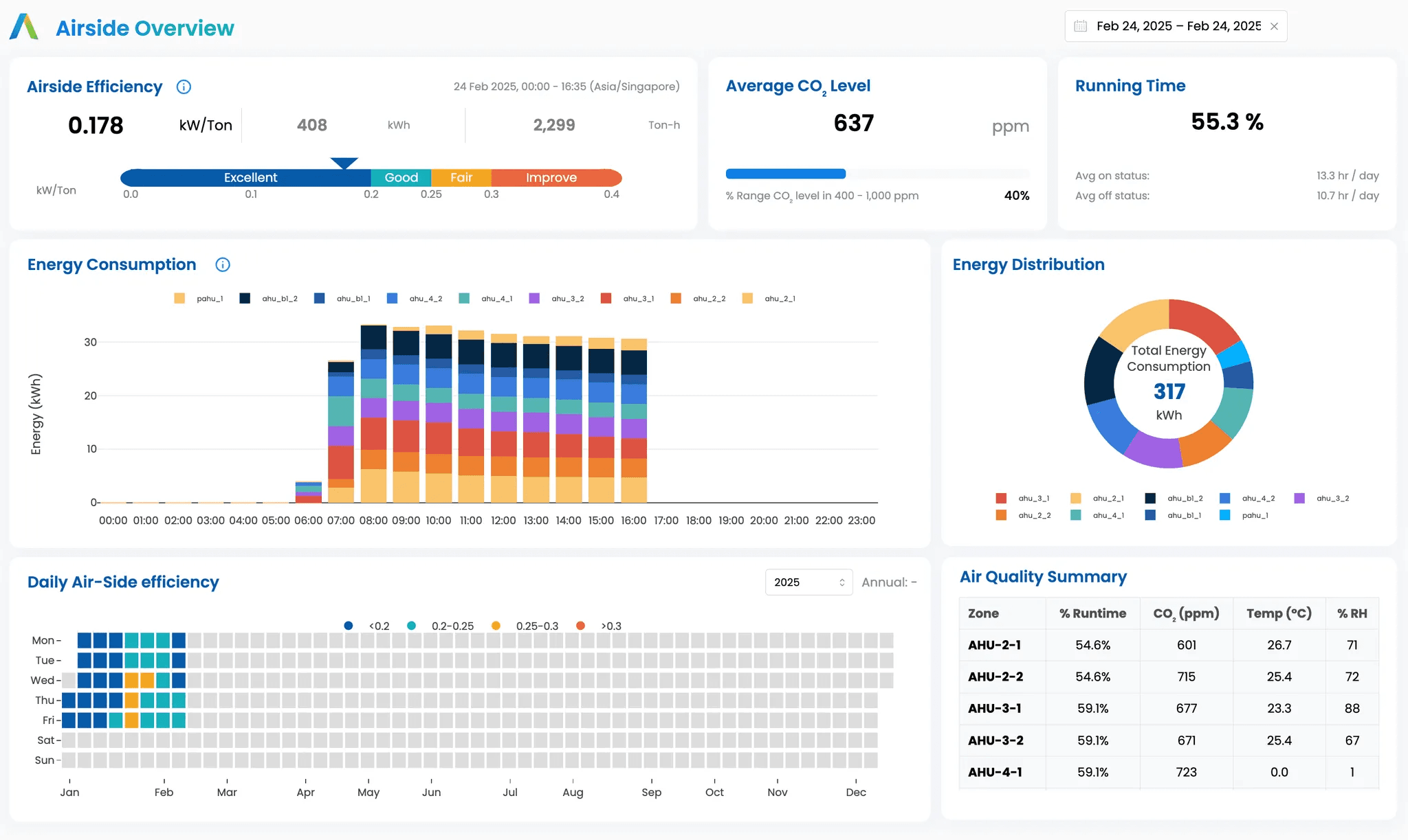 This module focuses on air-side systems such as AHUs, PAHUs, and VAVs. Users can monitor airflow, temperature distribution, and operational efficiency to optimize air handling performance.