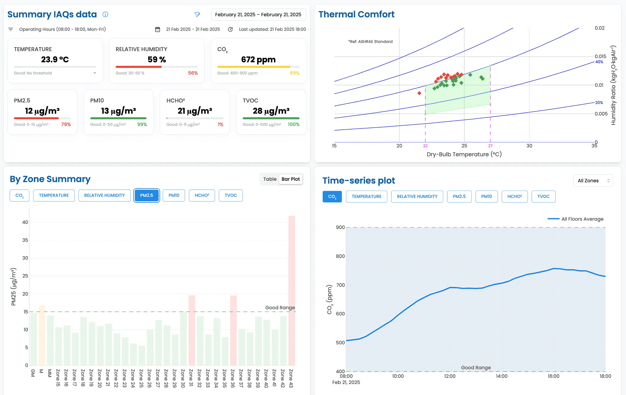 Monitors indoor air quality (IAQ) in real-time, providing insights into factors like CO2 levels, humidity, and pollutant concentrations.
